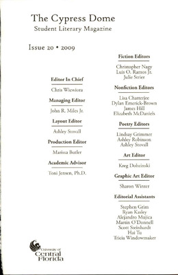 This year's Cypress Dome staff would like to express its sincere gratitude to all who made this publication possible. We especially wish to thank the Student Government Association, the Office of Academic Affairs, Dean Seidel and the College of Arts and Sciences, Dr. Dawn Trouard and the Department of English, and Dr. Joyce Lilie and the Art Department. For their guidance and time, thank you to Dr. Don Stap, Jeanne Leiby, Ru Kesler, and Carey Tibbetts.