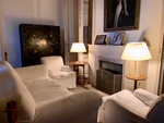 Green linen chairs with occasional table and Asian-themed lamp. Villa Ocampo (built 1891), former home of Victoria Ocampo, a significant figure in Argentina's cultural and artistic life. The house was fully restored in 2003. San Isidro, Buenos Aires Province.