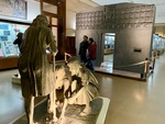 Three people stand near a sculpture depicting children at play. The artwork captures the essence of youth while surrounded by historical exhibits in the museum.