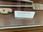 A display in Buenos Aires shows various archaeological objects from Peru. The items include tools and utensils that provide insight into ancient Peruvian culture and practices.