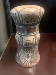 A ceramic artifact stands on display at UCA Museo de la Plata in Buenos Aires. The piece features intricate designs that reflect cultural and historical significance. Visitors engage with the exhibit.