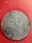 People explore the UCA Museo de la Plata in Buenos Aires. An ancient artifact is displayed on a red background, showcasing historical craftsmanship. Visitors admire the details and significance.