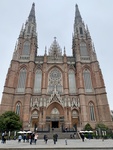 People explore the exterior of Lujan Basilica in Buenos Aires, Argentina. The historic church stands tall with its detailed facade. Trees and umbrellas are visible nearby.