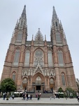 People gather outside the Basilica de Lujan at the UCA Museo de la Plata in Buenos Aires. The tall towers and intricate details draw attention from tourists and locals alike.