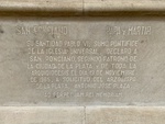 A stone inscription commemorates Pope Paul VI's declaration of San Ponciano as the patron saint of La Plata. The tribute is located at UCA Museo de la Plata, Buenos Aires, reflecting local history.