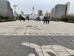 Visitors walk through the spacious square at UCA Museo de la Plata in Buenos Aires. Tall buildings rise in the background as people enjoy the area. The site features unique designs on the ground.
