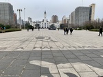 Visitors walk across the plaza in Buenos Aires, Argentina, close to the UCA Museo de la Plata. The area features modern buildings and historical architecture.