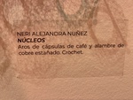 A display shows an art piece made from coffee capsules and copper wire. The installation is part of a collection at the UCA Museo de Arte Popular and invites viewers to explore creativity.