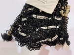 Visitors admire a textile art piece made of black loops and fabric pieces at UCA Museo de Arte Popular. This display showcases local craftsmanship and cultural heritage in Buenos Aires.