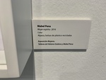 A sign displays details about a necklace by artist Mabel Pena made from recycled plastic bags. This piece is part of an exhibition titled Mujeres in Buenos Aires.