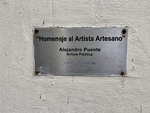 A metal plaque displays the title Homenaje al Artista Artesano by Alejandro Puente. It is installed at the UCA Museo de Arte Popular in Buenos Aires. Visitors view local art.