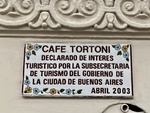 The sign at Cafe Tortoni highlights its designation as a place of tourist interest, reflecting the cafe's historical role in Buenos Aires. This information was marked in April 2003.