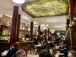 buenos aires,cafe tortoni,museum,dining,visitors,art,food,socializing,evening,glass ceiling,atmosphere,culture,wooden decor,city life,popular,tables,chairs,chatting,friends,drinks