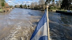 The view shows a river in Buenos Aires near UCA Tigre. The water appears muddy, and an Argentine flag is visible. Buildings and trees line the riverbank under a blue sky with clouds.