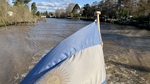 A boat travels along a river in Tigre, Buenos Aires, showcasing a flag waving gently in the breeze. The riverbanks feature trees and small structures under a partly cloudy sky.
