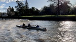 Three individuals row a small boat along the river at UCA Tigre in Buenos Aires. The scene captures the activity on the water with trees lining the banks and a hint of sunlight.