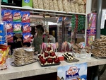 Visitors interact with vendors while purchasing sweets and snacks at a bustling market in Buenos Aires near UCA Tigre. The atmosphere is lively with colorful displays of treats.