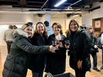 Four friends raise glasses of wine in celebration at UCA Tigre, Buenos Aires. Others mingle in the background, creating a lively atmosphere during the event.
