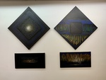 Four paintings are arranged on a white wall at UCA Tigre in Buenos Aires. The artworks feature various colors and shapes, highlighting different artistic techniques.