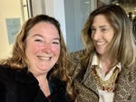 Two women share smiles and laughter while enjoying a social moment outside UCA Tigre in Buenos Aires. The atmosphere reflects the camaraderie of an evening event.