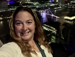 A visitor takes a selfie at UCA Tigre in Buenos Aires at night. The city lights illuminate the river and buildings, showcasing the vibrant life of the area.