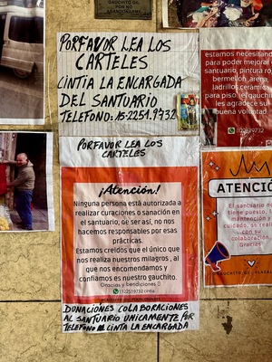 Collection of notices and photos on the wall at Santuario del Gauchito Gil in Parque Los Andes, Argentina showing activities and tributes