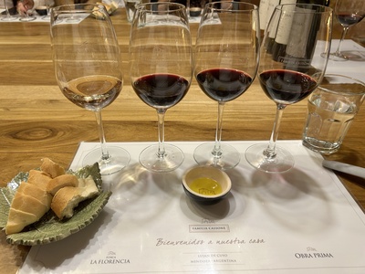 Wine tasting experience at Bodega Familia Cassone winery in Mendoza, Argentina with bread and olive oil on the table