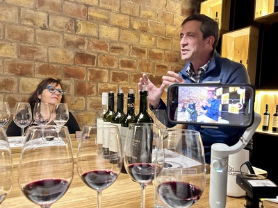 Visitors engage in a wine tasting session at Bodega Familia Cassone winery in Mendoza, Argentina, discussing wine and tasting techniques