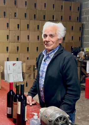 Man standing in winery Bodega Carmelo Patti in Mendoza, Argentina, with wine bottles on table