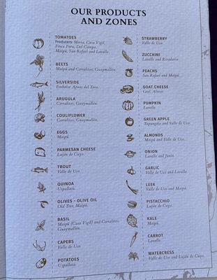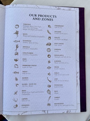 Menu of products and zones presented at Restaurant Casa Vigil El Enemigo in Mendoza, Argentina featuring local offerings