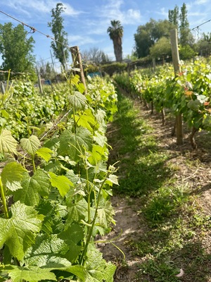 Visiting the vineyards at Casa Vigil El Enemigo in Mendoza, Argentina under a clear blue sky and bright sunlight
