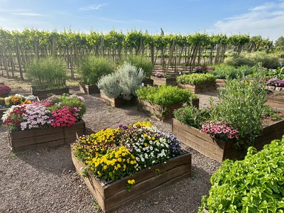 Explore the outdoor gardens and vineyards at Restaurant Casa Vigil El Enemigo in Mendoza, Argentina during a sunny day