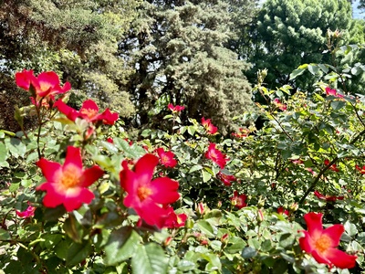 Bright red flowers bloom in Luján de Cuyo park during a sunny day in Mendoza, Argentina