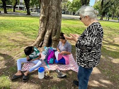 Children studying under a tree while an adult observes in Parque Los Andes in Buenos Aires, Argentina