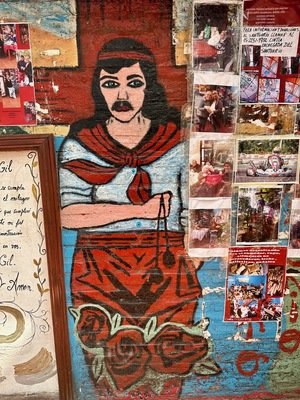 • Artwork of a woman at Santuario del Gauchito Gil in Parque Los Andes, Argentina, showcasing local culture and tradition through murals and photographs by Wendy Howard