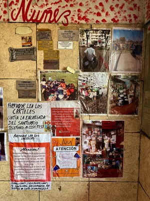 • Collection of notices and photos on the wall at Santuario del Gauchito Gil in Parque Los Andes, Argentina showing activities and tributes by Wendy Howard