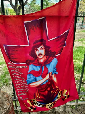 • Colorful banner of Gauchito Gil displayed at Santuario del Gauchito Gil in Parque Los Andes, Argentina, showcasing cultural significance by Wendy Howard