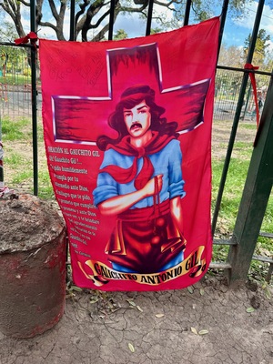 Colorful banner of Gauchito Gil displayed at Santuario del Gauchito Gil in Parque Los Andes, Argentina, showcasing cultural significance