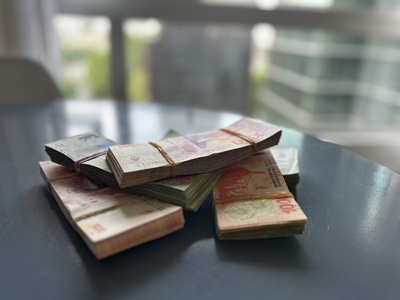 • Currency in Buenos Aires street market showing stacks of banknotes on table with city backdrop by Wendy Howard