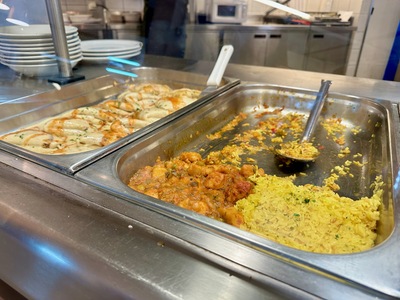 Daily menu and dishes displayed at Student Union food court in Edificio San Alberto Magno, Buenos Aires