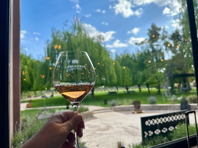 Enjoying a glass of rosé wine while overlooking the gardens at Lamadrid Estate Wines in Mendoza, Argentina during a sunny day