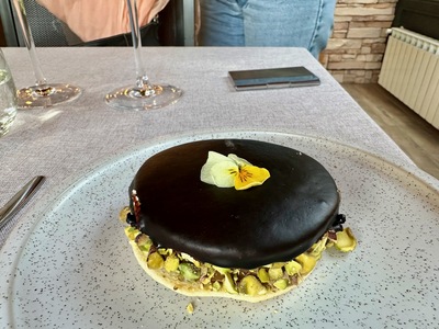 Dessert served at Lamadrid Estate Wines in Mendoza, Argentina features dark chocolate and pistachios with a floral garnish