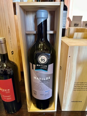 • Bottle of Matilde wine displayed in wooden case at Lamadrid Estate Wines in Mendoza, Argentina by Wendy Howard