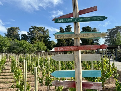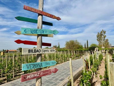 • Directional signpost in vineyard at Restaurant Casa Vigil El Enemigo in Mendoza, Argentina featuring distances to various cities by Wendy Howard