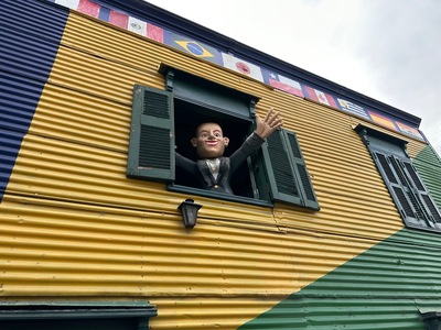 Colorful street art in Caminito with a figure welcoming visitors in Buenos Aires, Argentina