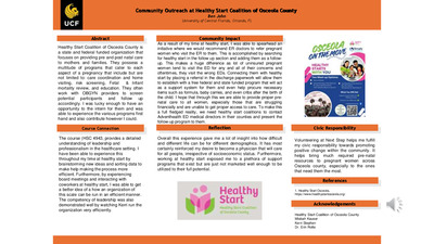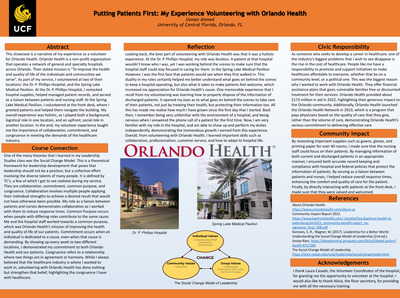 This showcase is a narrative of my experience as a volunteer for Orlando Health. Orlando Health is a non-profit organization that operates a network of general and specialty hospitals across Orlando. Their stated mission is “To improve the health and quality of life of the individuals and communities we serve”. As part of my service, I volunteered at two of their locations: the Dr. P. Phillips Hospital, and the Spring Lake Medical Pavilion. At the Dr. P. Phillips Hospital, I restocked hospital supplies, helped managed patient records, and served as a liaison between patients and nursing staff. At the Spring Lake Medical Pavilion, I volunteered at the front desk, where I greeted patients and helped them navigate the building. My overall experience was holistic, as I played both a background, logistical role in one location, and an upfront, social role in another location. In the end, my volunteer experience taught me the importance of collaboration, commitment, and congruence in meeting the demands of the healthcare industry.