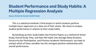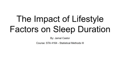 This project examines the impact of lifestyle factors on sleep duration using a multiple linear regression model. The dataset was sourced from Kaggle and includes 374 individuals and various predictors such as stress level, physical activity, heart rate, and age. Exploratory data analysis revealed a strong negative relationship between stress and sleep duration, while physical activity showed a weaker positive relationship.