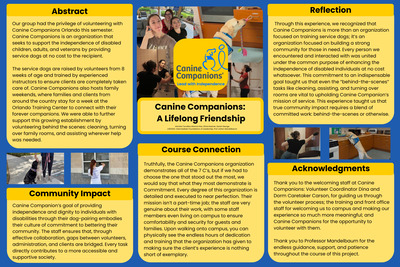 This project focused on promoting pet adoption awareness in partnership with Orange County Animal Services (OCAS). The purpose of our work was to help increase community awareness about the importance of adopting animals from shelters. Alongside my teammates, we participated in outreach activities where we held signs, interacted with the public, and shared information about adoptable animals and the benefits of adoption.
