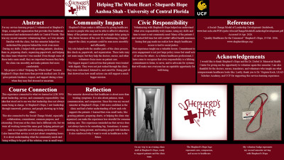 For my service learning project I wanted to work with Shepherd’s Hope. Shepherd’s Hope is a non profit organization that provides healthcare to those who are uninsured. Their mission statement is that they are “dedicated to our shared mission to provide free, quality healthcare to the uninsured.” During my time at Shepherd’s Hope I was involved in many different experiences. I learned how to be a discharge coordinator and discharged patients from their clinic visit and was able to give them resources on the next steps of their treatment plans. I also shadowed eligibility and nursing. Both positions allowed me to see how the EPIC system worked, which is their check- in system for patients, and allowed me to gain more patient interaction. I met and volunteered alongside a multitude of doctors, nurses, and students in order to make Shepherd’s Hope's mission statement a reality.