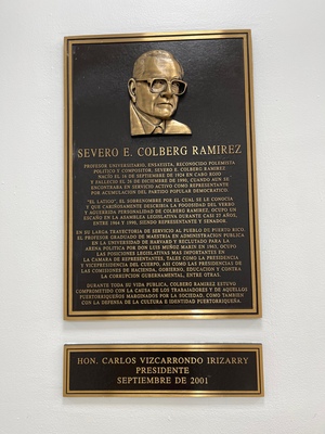 A bronze plaque honors Severo E. Colberg Ramirez, showcasing his achievements in Puerto Rican education. The plaque displays his likeness and significant contributions to the community.